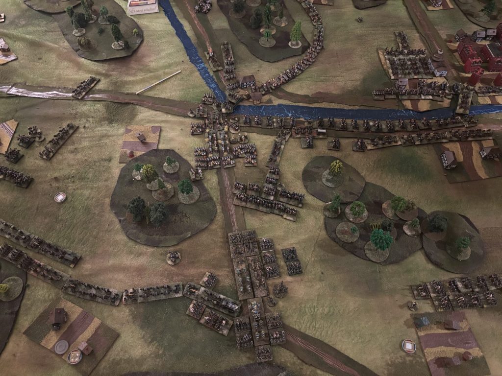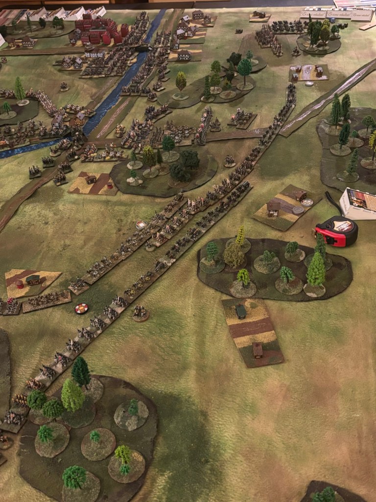 Something that was a LOT of fun for this game — it was completely different from the usual wargame! We didn’t just line up troops and throw them at each other. While the French have a terrible starting location, the Russian orders are to preserve the army and exit the table. They can advance into the French and make the crossing incredibly costly, but they also have to get their equipment off of the table. That ford, while dense, does help to uncork the French deployment. If the Russians are still fighting in the suburbs, it is nearly impossible to extricate that division.”