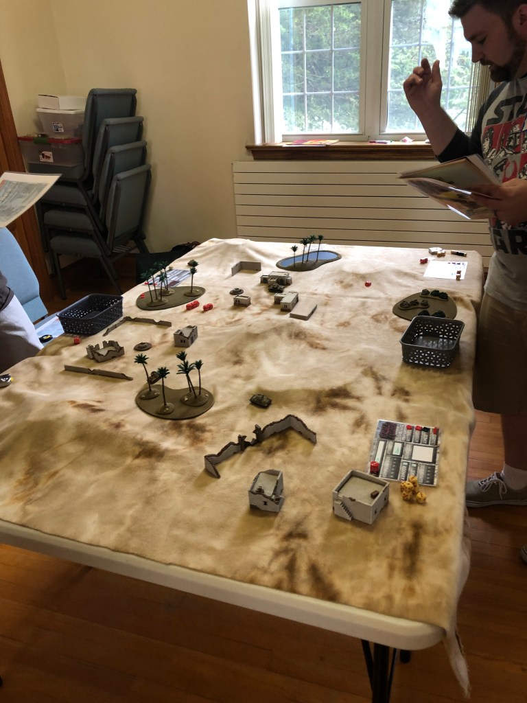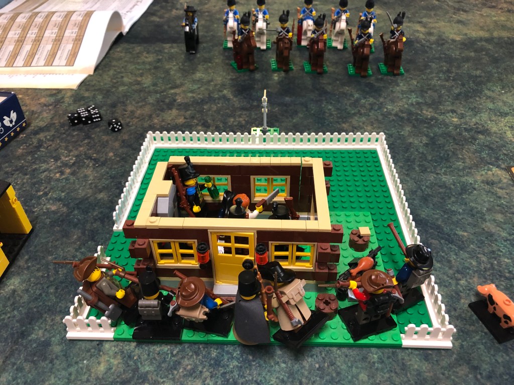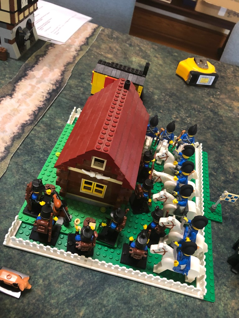 I attended Pickett’s Lard in Gettysburg the first weekend of May. This event was organized by the members of Lard USA a club dedicated to all things Lardy, i.e. the games put out by Too Fat Lardies. While I’m not the mega fan of the Lard games I’m always up for a day of gaming, eating and drinking so when I was invited I quickly checked my schedule, cleared the weekend with my wife and made plans to attend. In honor of the Lardies I stopped for coffee, a bacon scone and a cinnamon roll on the way up. When I got to the venue I saw there were about twelve people in attendance and there was the choice of three different games for the morning session: Sharpe Practice with Lego, a Chain of Command game set in the early war period of WWII and What a Tanker! game set in the desert. I have long wanted to put together a game using Lego mini figures for a children’s game at the HMGS conventions so Sharpe’s Practice was a no brainer. The scenario was a hostage rescue and after some poor luck early on my partner and I were able to pull off a win as the cards all suddenly came up blue three turns in a row. I always appreciate a good card mechanism in a game, it cuts down on poor dice rolls!