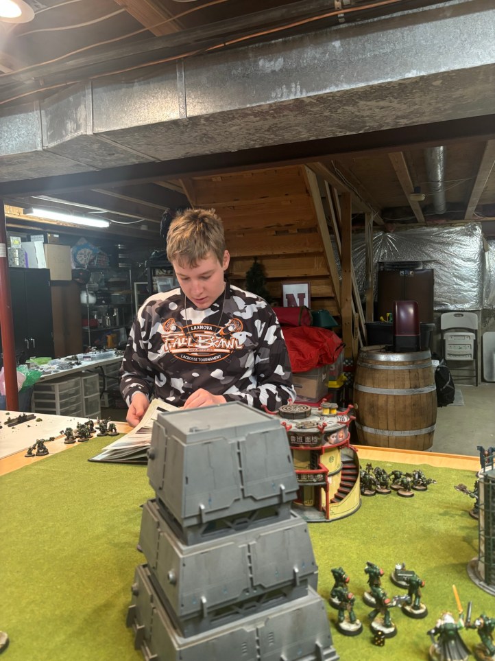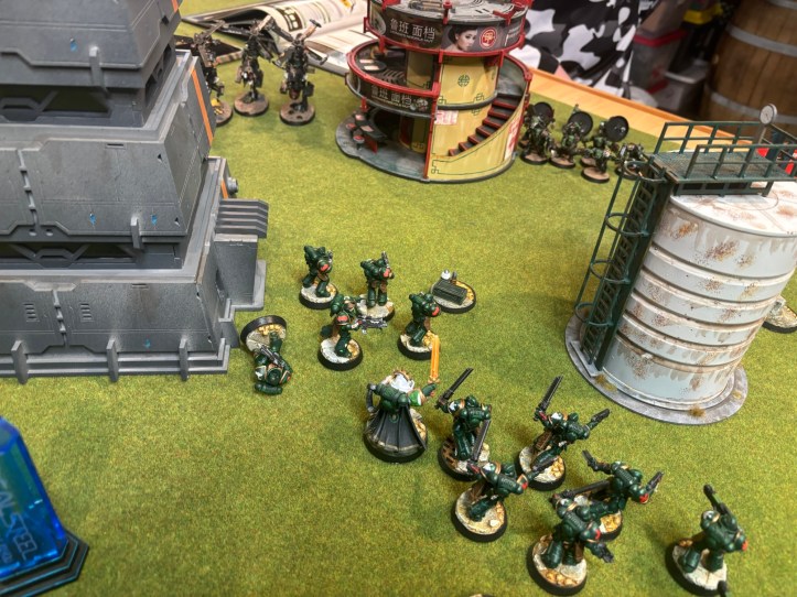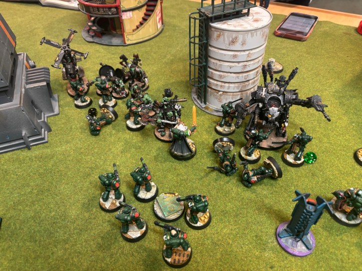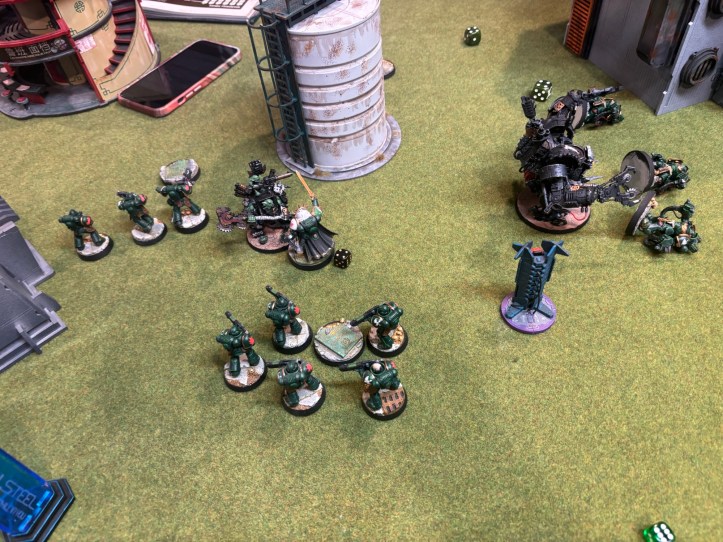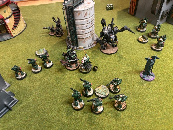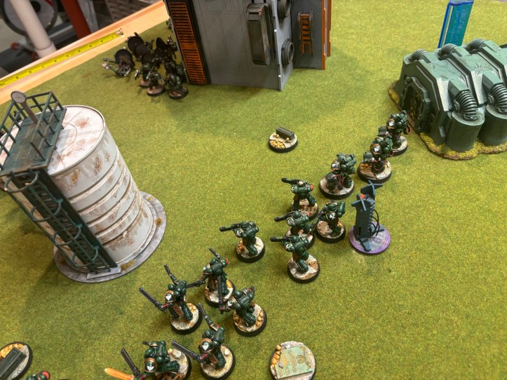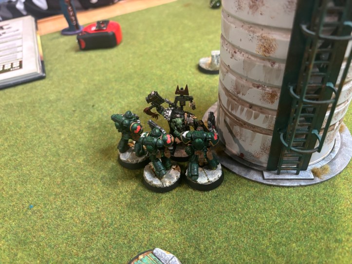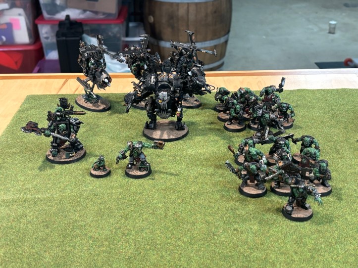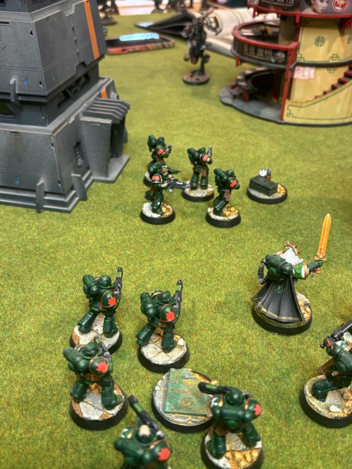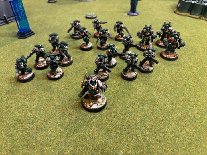 My son finished his Ork Combat Patrol and offered to do battle. Naturally I had to accept, even if I haven’t played any 40k 11th edition!! I figured I’d be able to figure it out easily enough, but we did decide to limit strategums to those in the main rule book. I don’t have a combat patrol painted but I have a random assortment of Dark Angles painted from the minis in the last few starter boxes so I quickly knocked out an army so we could play. I was so out of touch I didn’t realize point values in this edition were basically a more granular power level so I was quite confused when adding certain equipment didn’t change the point cost!