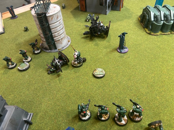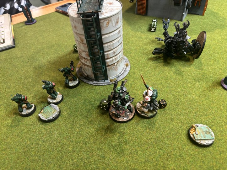 The Deff Dread charged into the Inercessors and tore them to shreds! The reaming Ork boys retreated behind the central fuel container to try and take an objective and prevent themselves from not getting gunned down. Not very Orky! The boss battle continued with the Master taking another wound but bringing the Warboss to within one!