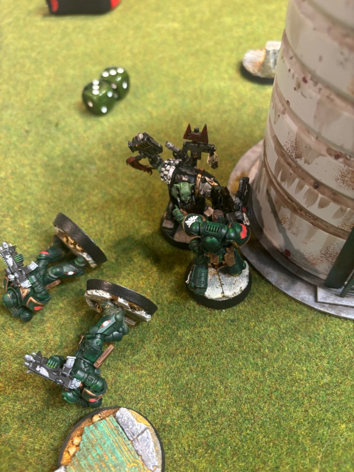 The Orks rampaged forward tired of shooting. The Deff Dread killed two Assault Marines and injured another while the orks on the other flank took out a Marine and wounded another for the loss of two Ork boyz. The Orks failed their Battle Shock test and fell back from the Dark Angels.