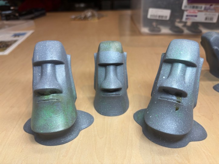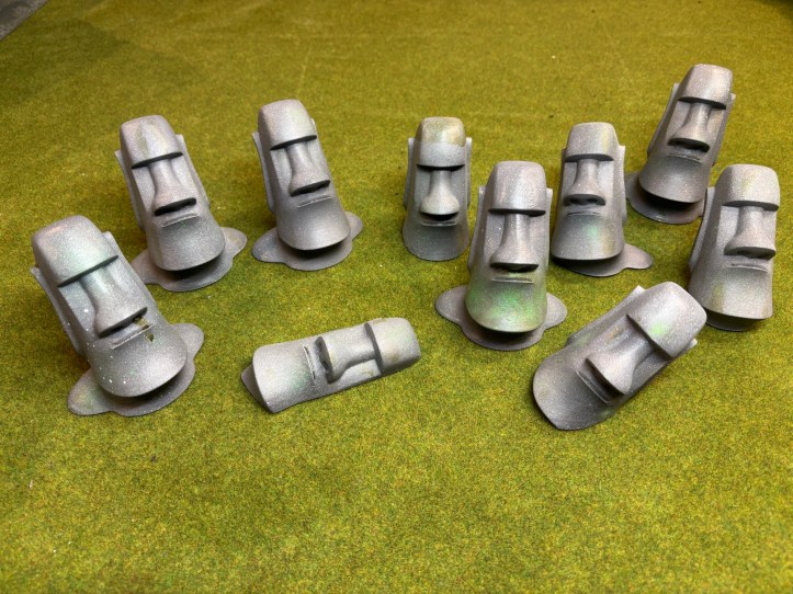 After working non stop on my Warmaster army for Adepticon and my 40k 2nd Edition Challenge entry I was chomping at the bit to get something quick and easy painted. I decided to work on my Easter Island Scatter terrain for my Gnome Wars Tiki Gnomes. These pieces were super easy to paint as I just used a variety of grey, and one white, spray paint from a can at different angles. I know these big stone heads wouldn’t be just grey but wanted to capture a cartoon like look. After the spray paint I picked out the mouths with a Nuln Oil to create some shadow between the lips and I used my airbrush to flick green paint off a brush to give a moss growth look. I also used some green washes in a few places to further the natural growth look and break up the grey.